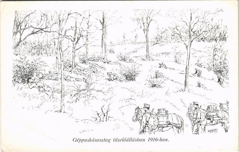 Géppuskásosztag tüzelőállásban 1916-ban. Honvédség története 1868-1918 / WWI Austro-Hungarian K.u.K. military art postcard, machine gun unit s: Garay (EB)
