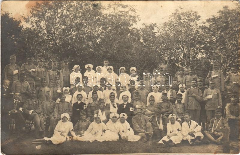 Sérült osztrák-magyar katonák Vöröskeresztes nővérekkel és orvosokkal a tábori kórház udvarán / WWI Austro-Hungarian K.u.K. military field hospital, injured soldiers with Red Cross nurses, medics and doctors. photo (fl)