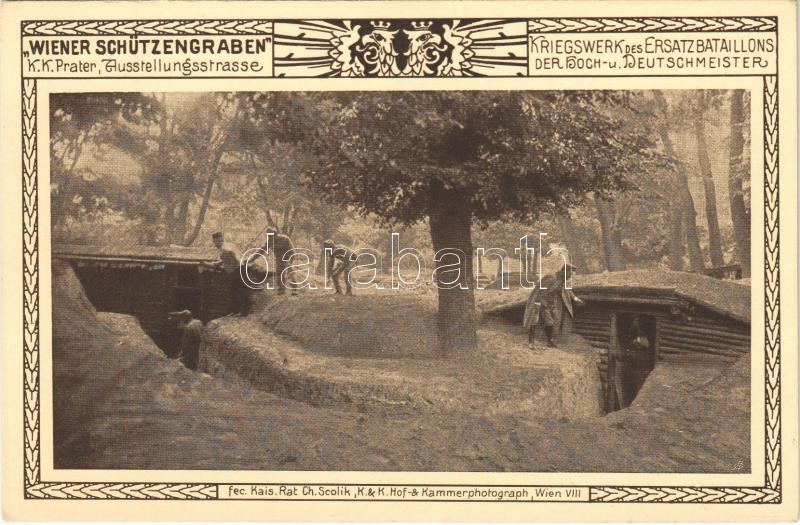 Wiener Schützengraben. K.K. Prater, Ausstellungsstrasse. Kriegswerk des Ersatzbataillons der Hoch- u. Deutschmeister. Fec. Kais. Rat. Ch. Scolik, K.u.K. Hof- & Kammerphotograph. Offizielle Karte vom Schützengraben des k.u.k. Kriegsfürsorgeamtes / WWI Austro-Hungarian K.u.K. military exhibition in Vienna, soldiers in the trenches