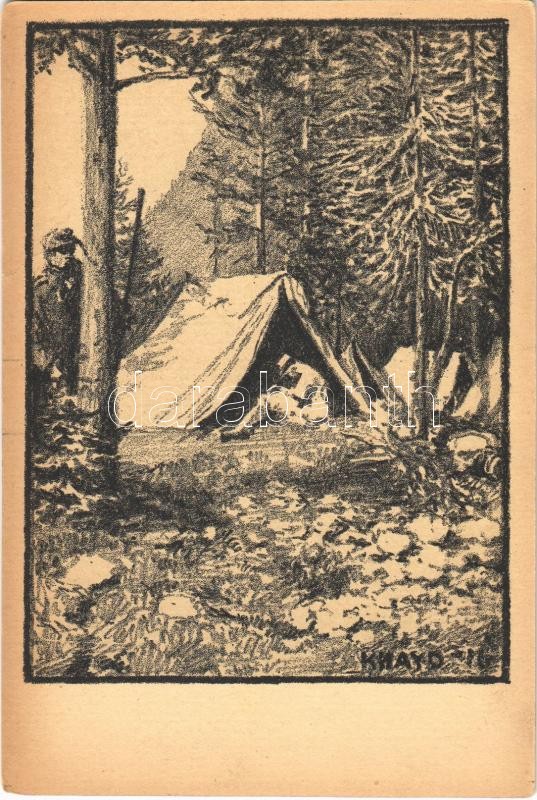 Zeltlager im Hochgebirgswald. Kriegshilfskarte des k.u.k. Feldverlages, Feldpost 512. Aus dem Skizzenbuch eines Kriegsmalers. Serie VI. Nr. 34. / WWI Austro-Hungarian K.u.K. military art postcard, support fund, tent camp in the forest s: K. Hayd (szakadás / tear)