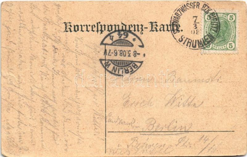 Beschreibung: 1908 Strumien, Schwarzwasser; Ringplatz, Kirche / market square, shops, church. S. Better, Photogr. Art Nouveau, floral (EB)