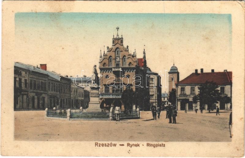 Beschreibung: Rzeszów, Resche; Ryenk, Mendel Kohn, Reichwald / Ringplatz / square, shops + "K.k. Landwehrspital in Rzeszów" (EK)