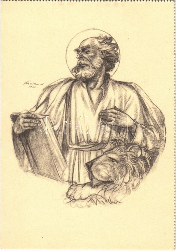 Szent Márk evangelista. Márton Lajos freskó kartonja az abasári templomhoz. Márton L. templomfestő műterme kiadása / Saint Mark the Evangelist s: Márton L.