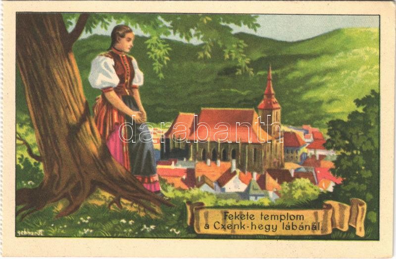 Brassó, Kronstadt, Brasov; Fekete templom a Cenk hegy lábánál. Kiadja a Székely Egyetemi és Főiskolai Hallgatók Egyesülete / Biserica Neagra, Tampa / Hungarian irredenta art postcard, Lutheran church, mountain s: Gebhardt (képeslapfüzetből / from postcard booklet)