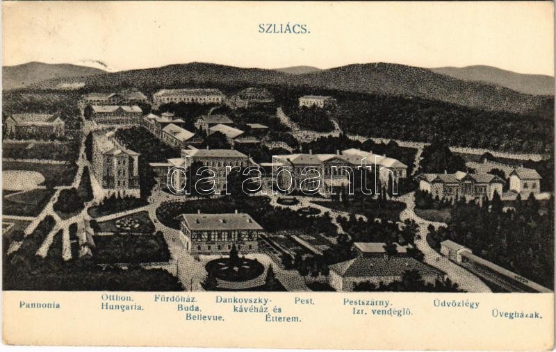 1912 Szliács, Sliac; Pannonia, Otthon, Hungaria, Fürdőház, Buda, Bellevue, Bristol, Újpest, Huszka vendéglő, Amália, Strauss, Dankovsky kávéház és étterem, Pest és Pestszárny szálloda, Izraelita vendéglő, Üdvözlégy, Üvegház kertész lak / hotels, Jewish restaurant, greenhouse, café, villa