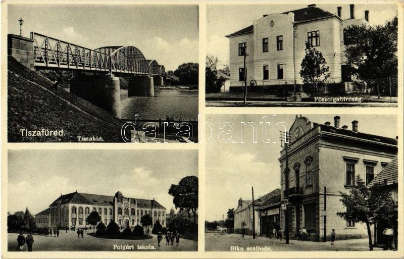 Tiszafüred, Tisza híd, Főszolgabíróság, Polgári iskola, Bika szálloda.... https://www.darabanth.com/de/400-Fernauktion/400.0/Ansichtskarten/Ungarn~1000006/Tiszafured-Tisza-hid-Foszolgabirosag-Polgari-iskola-Bika-szalloda-Goldstein-Adolf-kiadC3~II2122160
