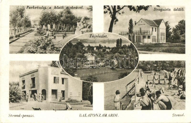 Zamárdi, Balatonzamárdi; Hősök szobra, Droguista üdülő, Strand-penzió https://www.darabanth.com/de/400-Fernauktion/400.0/Ansichtskarten/Ungarn~1000006/Zamardi-Balatonzamardi-Hosok-szobra-Droguista-udulo-Strand-penzio~II2447130
