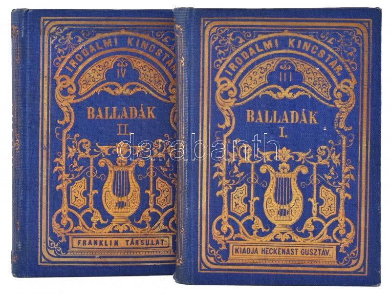 Magyar balladák könyve I-II. köt. Válogatott gyűjtemény. Irodalmi Kincstár III-IV. Bp.-Pest,1874-1861,Franklin-Heckenast Gusztáv, 1 (címkép, Arany János arcképe) t.+192 p.; 192 p. Kiadói dúsan aranyozott egészvászon-kötés, a borítón kopásnyomokkal.