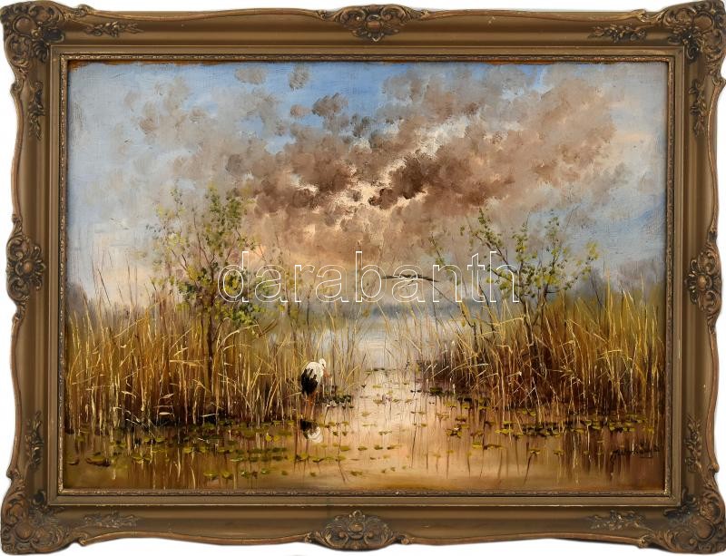 Beschreibung: Mesterházy Dénes (1900-1949 körül): Gólya a vízparton. Olaj, vászon. Dekoratív, historizáló stílusú, hátsó élénél kissé sérült fa keretben. 50x70 cm