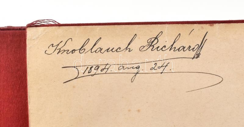 Beschreibung: Bársony dÃszmappa, felújÃtott, aranyoztt fém szállal hÃmzett "KR" monogram. Szép állapotban. 31x23cm. Belsejében autográf felirat: Knoblauch Richárd 1894.aug. 24.