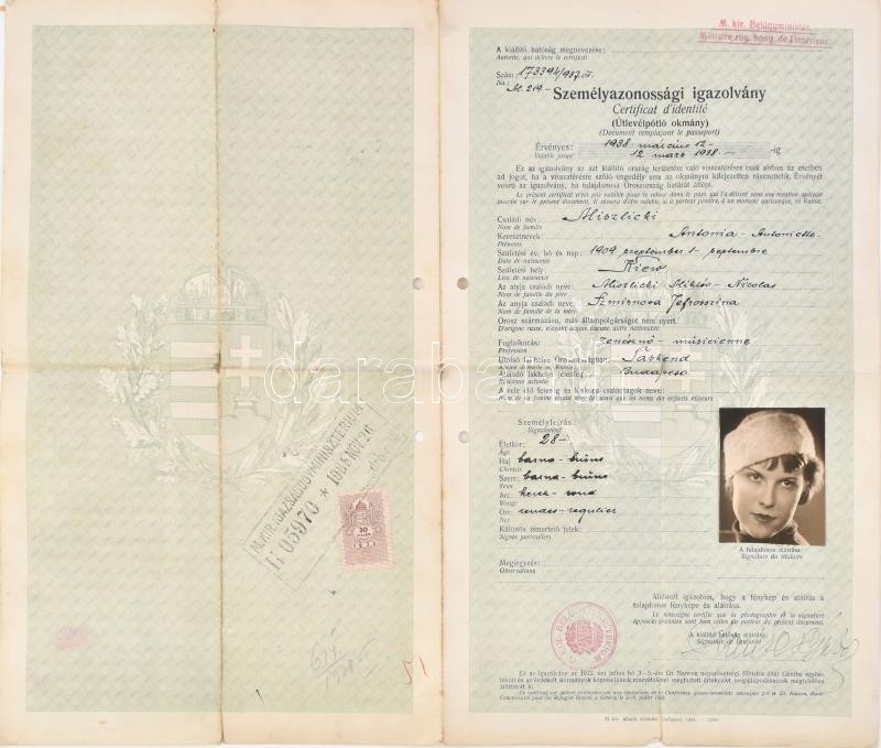 1938 Antoinette Myszlicki orosz/lengyel énekesnő fényképes útelevele https://www.darabanth.com/de/400-Fernauktion/400.0/Kunst-Dokumente-andere-Sammelgebiete/Dokument~500016/1938-Antoinette-Myszlicki-oroszlengyel-enekesno-fenykepes-utelevele~II2453228