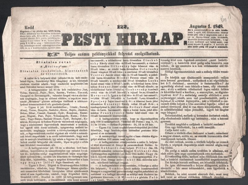 Beschreibung: 1848 A Pesti Hírlap augusztus 1-i száma