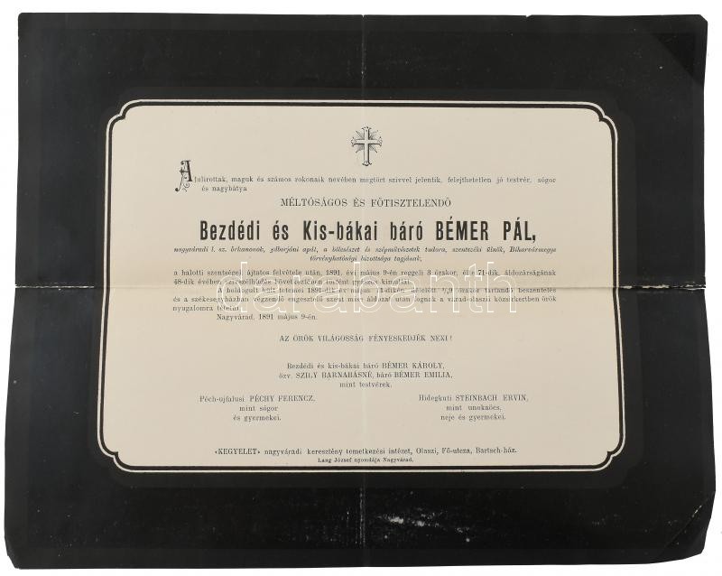 Beschreibung: 1891 Nagyvárad, Bezdédi és Kis-bákai báró Bémer Pál halotti értesítője, szakadással