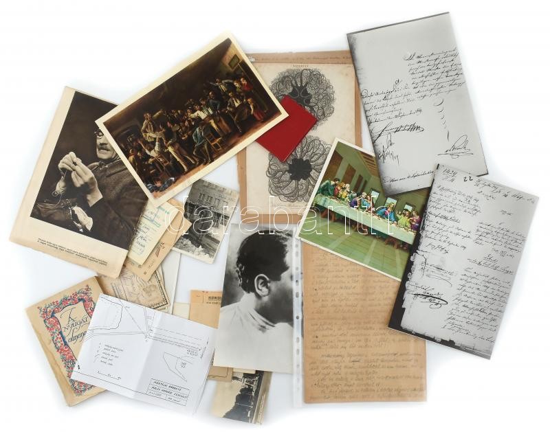 cca 1769-1951 Vegyes papírrégiség tétel, benne The Capu Medusae metszet, Nyugat Almanach, képeslapok - tábori is, fotók, buddhista kézirat, kéziratos versek