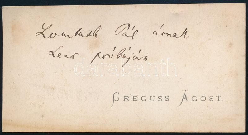 Beschreibung: Greguss Ágost (1825-1882) bölcsész, esztéta, tanár névjegykártyája, rajta Greguss Ágost saját kezű soraival: "Zombath Pál úrnak Lear próbáján",5x9 cm