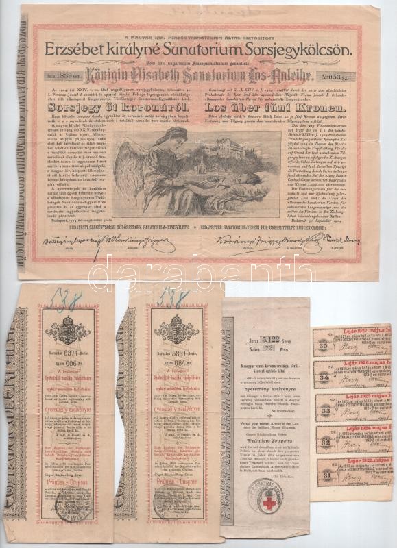 Budapest 1882. "Magyar szent korona országainak vörös-kereszt egylete" kisorsolási kötvénye 5Ft értékben bélyegzésekkel + Budapest 1888. "Magyarországi Jószív-Egyesület" sorsjegykölcsön 2Ft-ról, szárazpecséttel + Budapest 1904. "Erzsébet királyné Sanatorium Sorsjegykölcsön" sorsjegye 5K értékben, magyar és német nyelven, szárazpecséttel T:III-