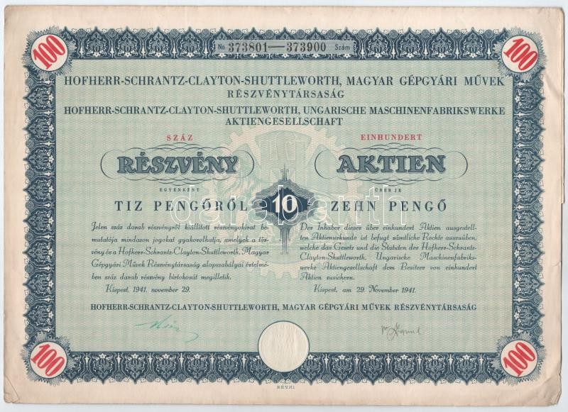 Budapest 1941. "Hofherr-Schrantz-Clayton-Shuttleworth, Magyar Gépgyári Művek Részvénytársaság" részvénye 10P-ről, magyar és német nyelven, szelvényekkel, szárazpecséttel T:II
