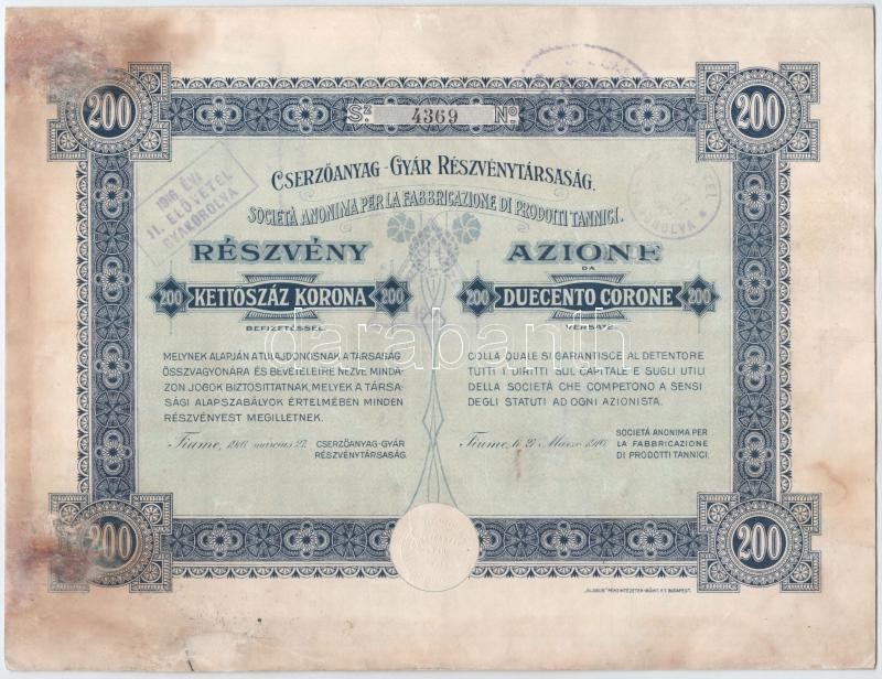 Fiume 1916. "Cserzőanyag-Gyár Részvénytársaság" részvénye 20... https://www.darabanth.com/de/400-Fernauktion/400.0/Numismatik/Aktien-und-Tickets~2000005/Fiume-1916-Cserzoanyag-Gyar-Reszvenytarsasag-reszvenye-200K-rol-szelvenyekkel-szarazp~II2455307