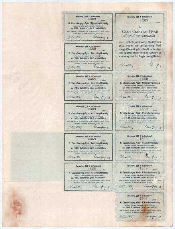 Beschreibung: Fiume 1916. "Cserzőanyag-Gyár Részvénytársaság" részvénye 200K-ról szelvényekkel, szárazpecséttel, bélyegzésekkel T:III restaurál