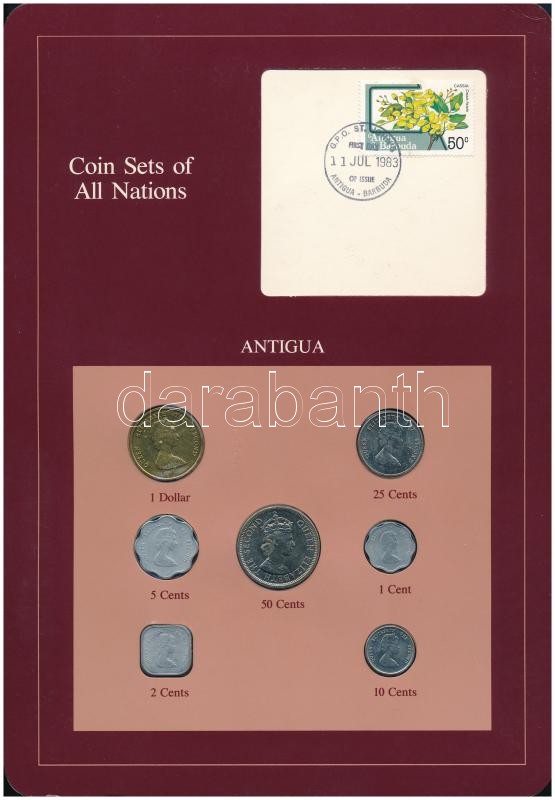 Antigua 1965-1983. 1 Cent - 1 Dollar (7xdiff) "Coin Sets of All Nations" coin set on cardboard with stamp C:UNC-VF