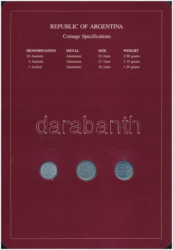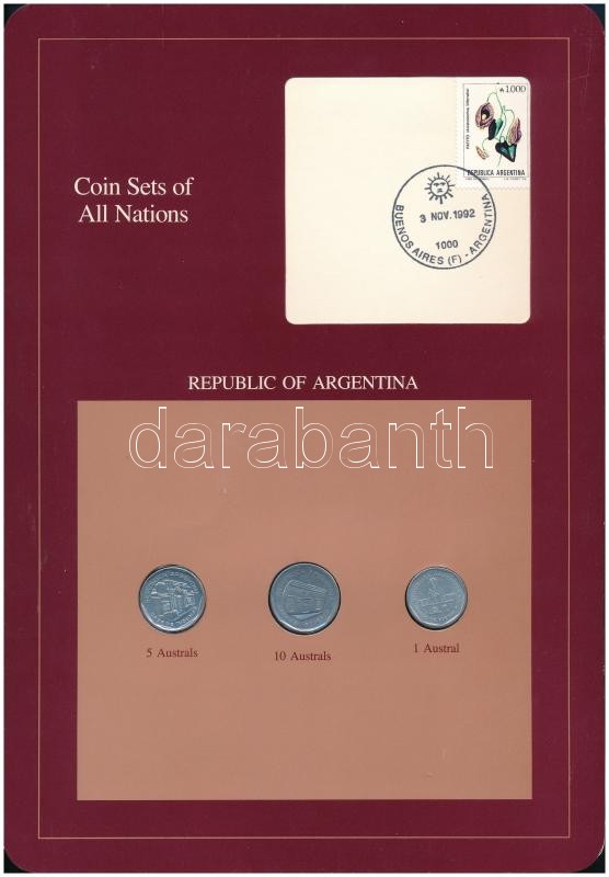 Argentina 1989. 1 Austral - 10 Australs (3xdiff) "Coin Sets of All Nations" coin set on cardboard with stamp C:AU-VF