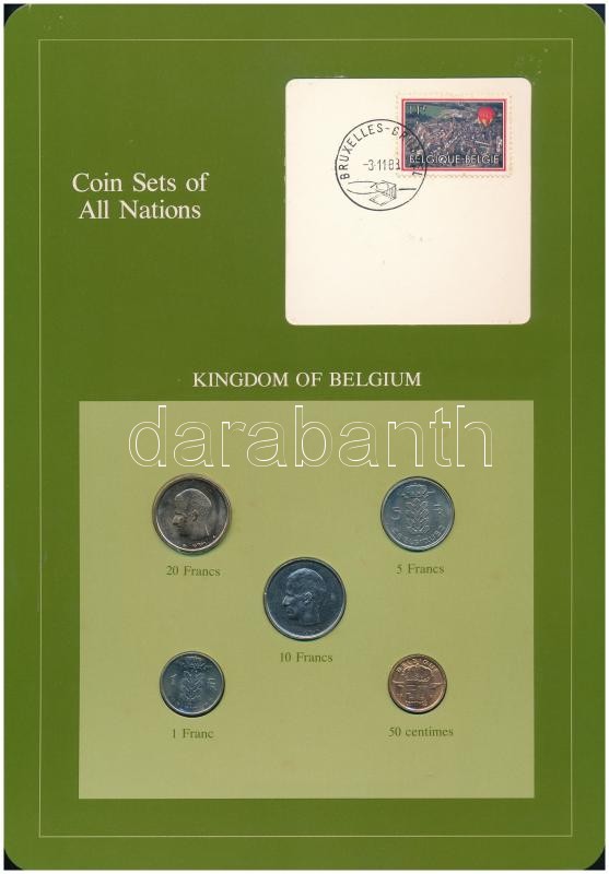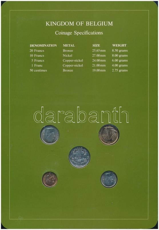 Belgium 1976-1982. 50 Centimes - 20 Francs (5xdiff) "Coin Sets of All Nations" coin set on cardboard with stamp C:UNC,AU