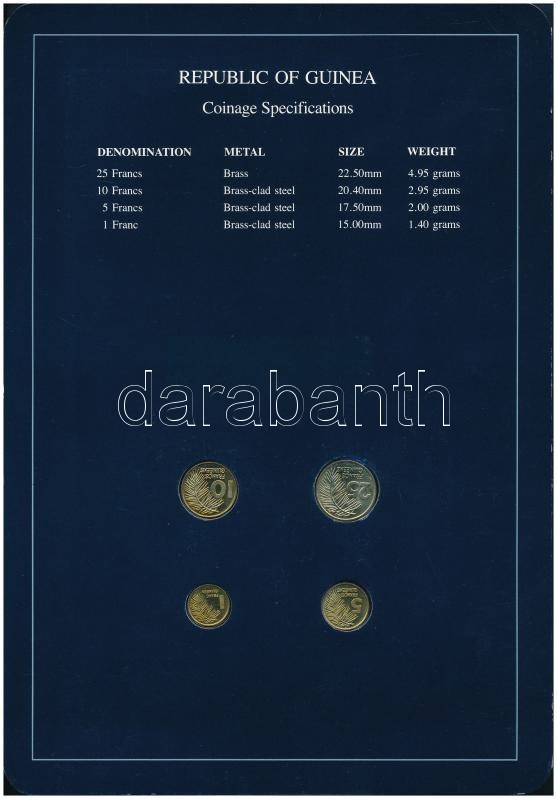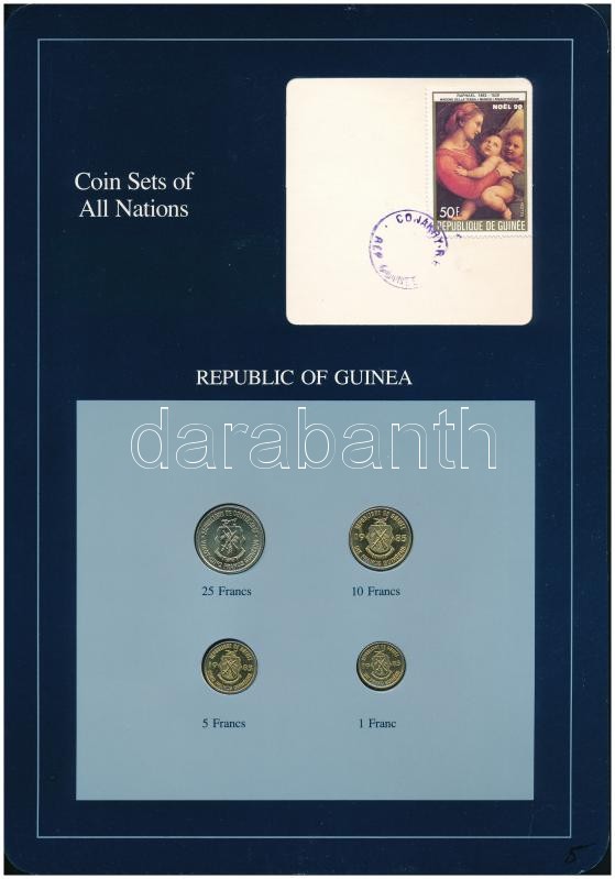 Guinea 1985-1987. 1Fr - 25Fr (4xklf), "Coin Sets of All Nations" forgalmi szett felbélyegzett kartonlapon T:1,1- Guinea 1985-1987. 1 Franc - 25 Francs (4xdiff) "Coin Sets of All Nations" coin set on cardboard with stamp C:UNC, AU