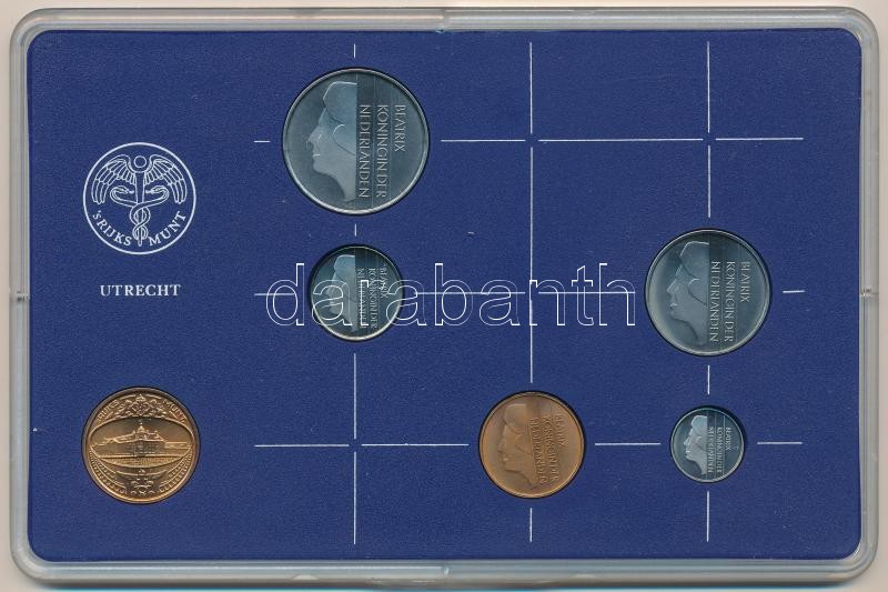 Beschreibung: Hollandia 1985. 5c-2 1/2G (5xklf) forgalmi sor műanyag tokban, pénzverdei zsetonnal T:1 Netherlands 1985. 5 Cent - 2 1/2 Gulden (5xdiff) coin set in plastic case and Coin Mint jeton C:UNC