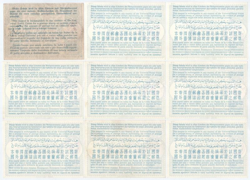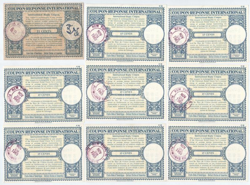 Amerikai Egyesült Államok 19??. 11c "Nemzetközi Válaszdíjszelvény" vízjeles papíron + 1965. 15c "Nemzetközi Válaszdíjszelvény" vízjeles papíron (8x) T:III USA 19??. 11 Cents "International Reply Coupon" on watermarked paper + 1965. 15 Cents "International Reply Coupon" on watermarked paper (8x) C:F