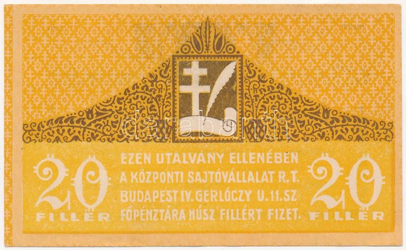 Budapest 1919. 20f "Központi Sajtóvállalat R.T." T:II,II- Hu... https://www.darabanth.com/de/400-Fernauktion/400.0/Numismatik/Notgeld-aus-Papier-und-Metall~2000006/Budapest-1919-20f-Kozponti-Sajtovallalat-RT-TII-II-Hungary-Budapest-1919-20-Filler-KC3~II2455980