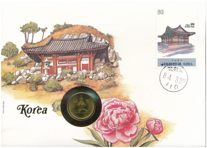 South Korea 1985. 10 Won in envelope with stamp and cancellation, with German description C:UNC