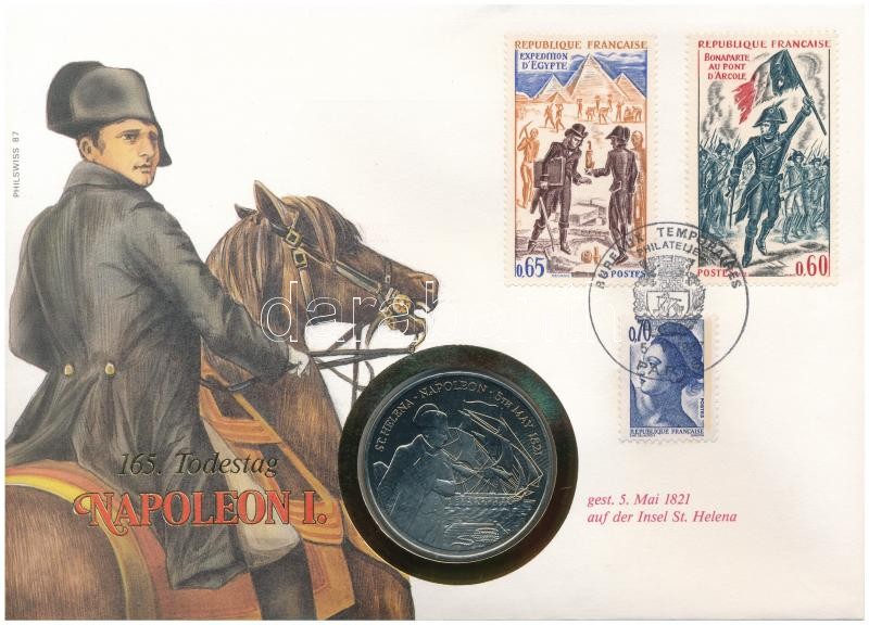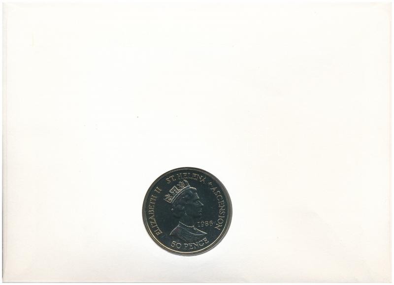 Szent Ilona 1986. 50p Cu-Ni "Napoleon halálának 165. évfordulója" érmés, francia bélyeggel felbélyegzett borítékban, alkalmi bélyegzéssel, német nyelvű leírással T:1