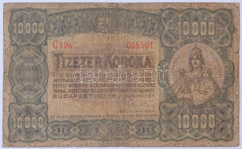 1923. 10.000K "Magyar Pénzjegynyomda Rt. Budapest" T:III- https://www.darabanth.com/de/400-Fernauktion/400.0/Numismatik/Ungarische-Banknoten~2000007/1923-10000K-Magyar-Penzjegynyomda-Rt-Budapest-TIII-~II2435754