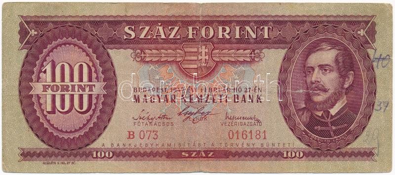 1947. 100Ft "B 073 016181" T:III Adamo F27 https://www.darabanth.com/de/400-Fernauktion/400.0/Numismatik/Ungarische-Banknoten~2000007/1947-100Ft-B-073-016181-TIII-Adamo-F27~II2433407