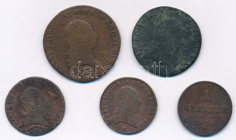 Beschreibung: 1800B 1kr Cu "I. Ferenc" + 1800S 3kr Cu "I. Ferenc" + 1812B 1kr Cu "I. Ferenc" + 1812G 3kr Cu "I. Ferenc" + 1851B 1kr Cu T:3