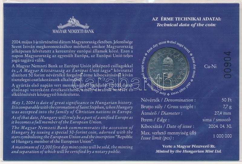 Beschreibung: 2004. 50Ft Cu-Ni "Magyar Köztársaság az Európai Unió tagja" első napi veret, sorszámozott "00904" emléklapon T:BU