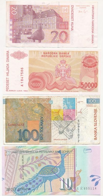Horvátország 2012. 20K + Bosznia-Hercegovina / Szerb Köztársaság / Banja Luka 1993. 50.000D + Slovenia 1992. 100T + Macedónia 2008. 10D T:I-III