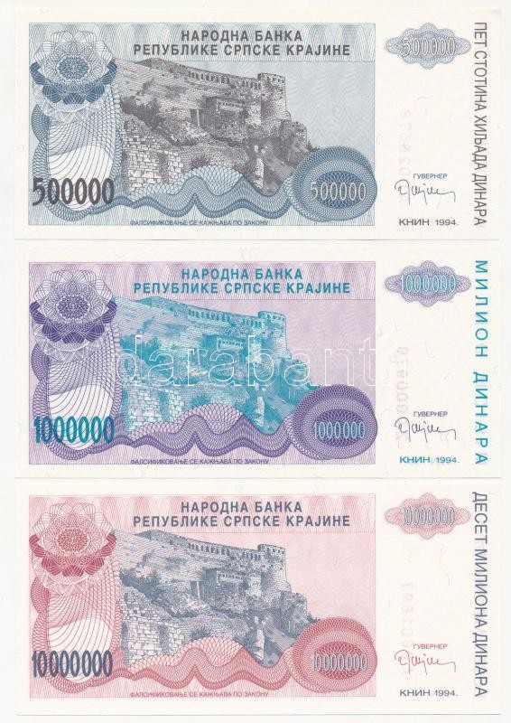 Horvátország / Krajnai Szerb Köztársaság 1994. 500.000D + 1.000.000D "Z 0000979" sorszámmal, pótkiadás + 10.000.000D T:I