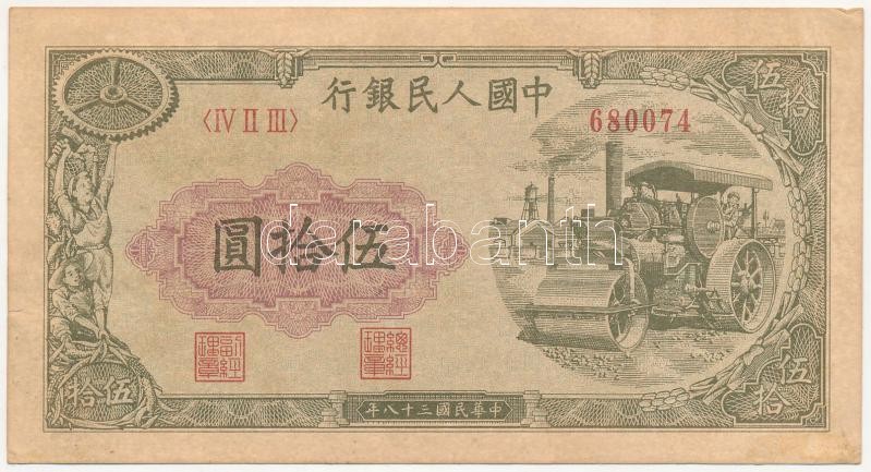 China 1949. 50 Yuan C:XF folde... https://www.darabanth.com/de/400-Fernauktion/400.0/Numismatik/Weltweit-Banknoten~2000013/Kina-1949-50Y-TII-sarokhajlasok-fo-China-1949-50-Yuan-CXF-folded-corners-spotted-Krause-P~II2446835
