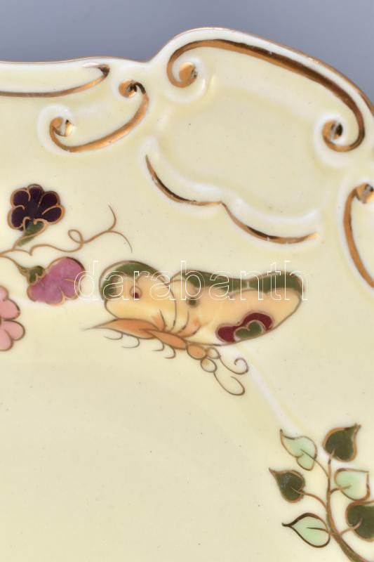 Beschreibung: Zsolnay pillangó mintás süteményes tál.. Kézzel festett, jelzett, mázrepedésekkel. d: 24 cm