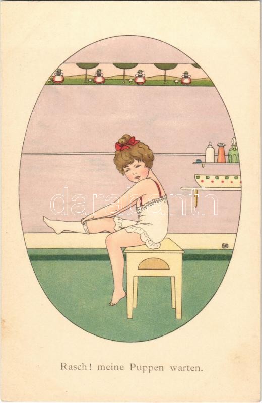Beschreibung: Rasch! meine Puppen warten / Children art postcard. M. Munk Vienne Nr. 905. artist signed