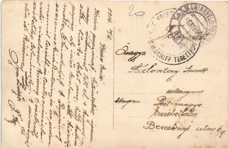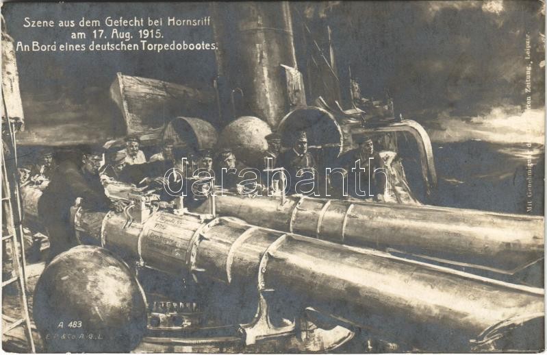 1916 Szene aus dem Gefecht bei Hornsriff am 17. Aug. 1915. An Bord eines deutschen Torpedobootes / WWI German Navy (Kaiserliche Marine) art postcard, submarine, mariners + "K.U.K. KRIEGSMARINE SM SCHIFF TEGETTHOFF"