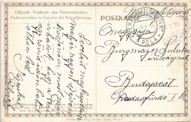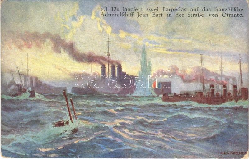1916 U 12 lanciert zwei Torpedos auf das französische Admiralschiff Jean Bart in der Strasse von Otranto. Offizielle Postkarte des Österr. Flottenvereines zugunsten der Kriegsfürsorge. Brüder Kohn B.K.W.I. / WWI Austro Hungarian Navy art postcard, U-12 torpedoing the French "Jean Bart" warship in the Battle of the Strait of Otranto s: Alex Kircher + "K.U.K. KRIEGSMARINE SMS HELGOLAND" (EK)