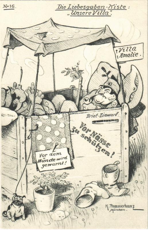 Beschreibung: Das Liebesgaben-Kiste: Unsere Villa / WWI German military art postcard, humour. Nr. 1016. s: K. Pommerhanz (Rb)