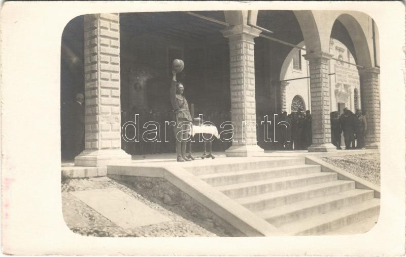 Első világháborús osztrák-magyar katonai parancsnokság Olaszországban, ünnepély megnyitása. "Bármely járműnek a Piazza del Duomo-n való megállása tilos!" feliratos tábla / WWI Austro-Hungarian K.u.K. military, headquarters in Italy. photo