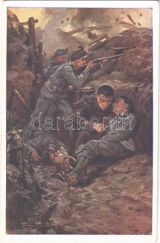 Feldkurat Emil Boscarelli erteilt |ahrend des Kampfes der Landesschützen vom Trientner Regiment, selbts schon schwer verwundet, einem sterbenden Soldaten, nachdem er ihm Samariterdienste geleistet hatte, den letzten geistlichen Zuspruch. Aus dem goldenen Buche der Armee Serie V. Offizielle Karte für Rotes Kreuz, Kriegsfürsorgeamt, Kriegshilfsbüro Nr. 575. / WWI Austro-Hungarian K.u.K. military art postcard s: Fr. Jung (EK)
