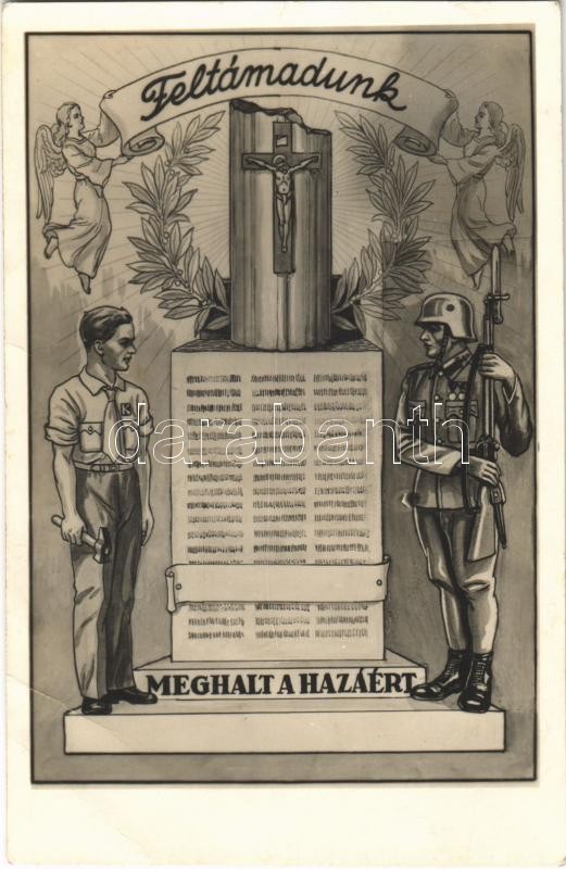 "Feltámadunk! Meghalt a hazáért" - 25. Jubileumi év hősi halottainak felállítandó emlékmű javára. Kiadja a Magyar Katolikus Legényegyletek Országos Szövetsége / WWII Hungarian military, war heroes' monument, charity card (EB)