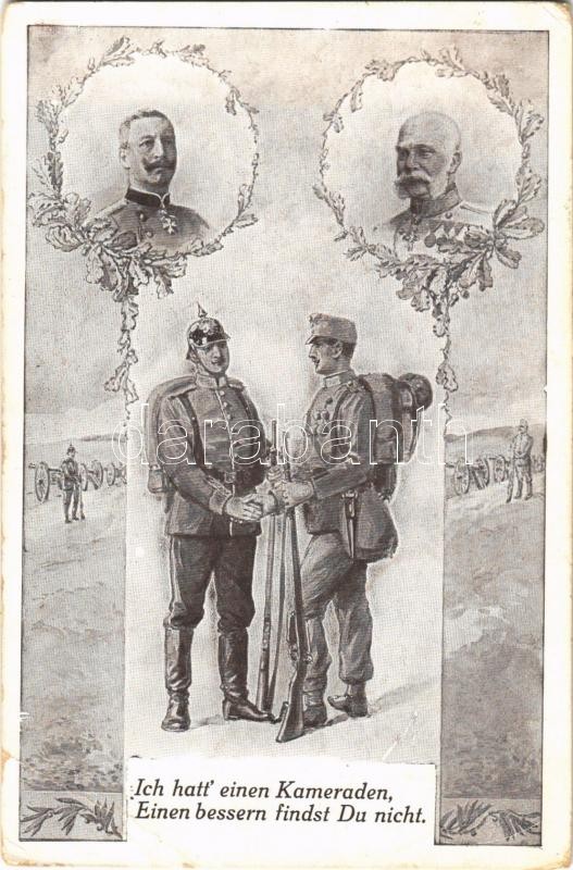 Ich hatt' einen Kameraden, Einen bessern findst Du nicht / WWI German and Austro-Hungarian K.u.K. military art postcard, Viribus Unitis propaganda, Franz Joseph I of Austria, Wilhelm II (EB)