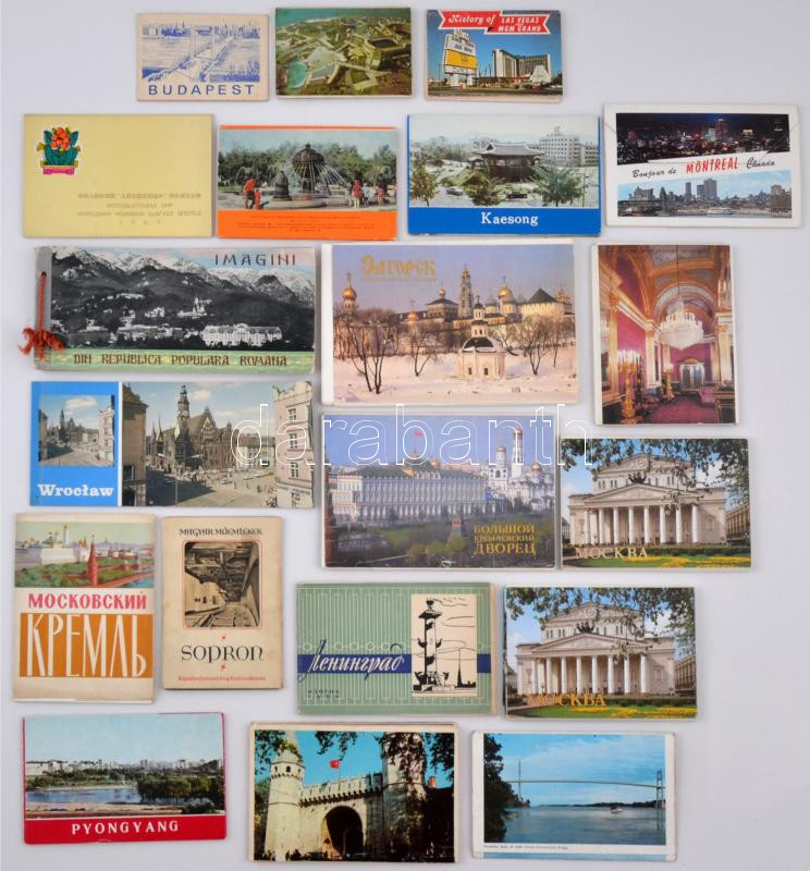 Moscow, Sopron, Leningrád, Omsk, Kaesong, Pyongyang - 2 sorozat nagyobb méretű képeslapokkal; 2 képeslap füzet: Imagini (fekete fehér lapokkal) és Wroclaw; valamint 6 leporello: Istanbul, Budapest, Marineland, Las Vegas, Montreal / 12 Modern postcards series in cases, 2 modern postcards booklets and 6 leporello