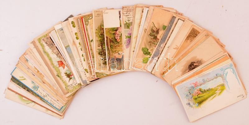 Kb. 100 db RÉGI századfordulós motívum képeslap, zsáner lapok, újévi, karácsonyi és húsvéti üdvözlő / Cca. 100 pre-1910 motive postcards: greetings, flowers